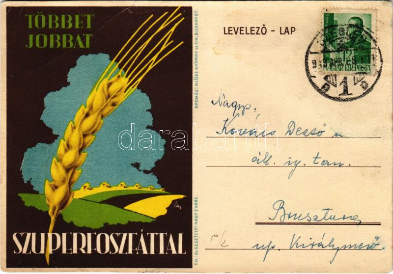 1943 Többet jobbat szuperfoszfáttal. Mezőgazdasági reklám. Klösz Györg... https://www.darabanth.com/hu/472-Gyorsarveres/472.0/Kepeslapok/Reklam~1500076/1943-Tobbet-jobbat-szuperfoszfattal-Mezogazdasagi-reklam-Klosz-Gyorgy-es-Fia-nyomas-Hun~II3200210