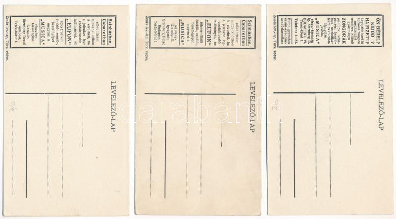 Leírás: 3 db RÉGI kottás zenés levelező-lap hátoldali reklámmal: Musica részvénytársaság