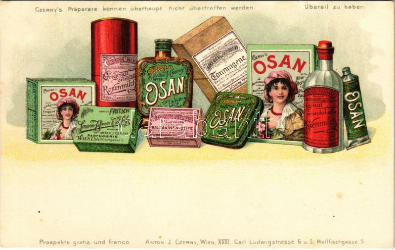 Osan - Czerny's Präparate können überhaupt nicht übertroffen werden. Anton J. Czerny, Wien XVIII. Carl Ludwigstrasse 6. und I. Wallfischgasse 5. / Bécsi kozmetikumok reklámlapja / Viennese cosmetics advertisement, litho
