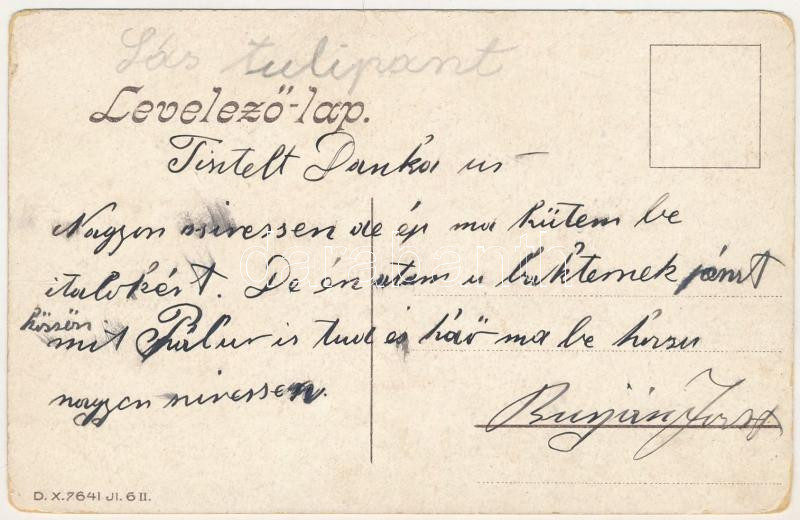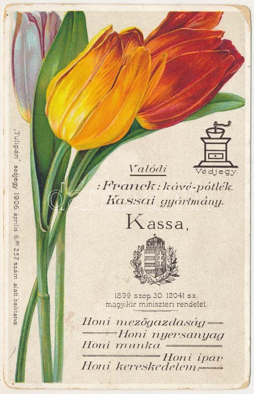 Valódi Frank kávé-pótlék reklámja. Kassai gyártmány. Kassa 1899. szep. 30. 12041 sz. magy. kir. miniszteri rendelet, címer. Honi mezőgazdaság, honi nyersanyag, honi munka, honi ipar, honi kereskedelem. "Tulipán" szójegy 1906. április 6-án 257. szám alatt beiktatva. litho / Franck coffee-substitute advertisement, Hungarian folklore, coat of arms, tulip, litho (kopott sarkak / worn corner)