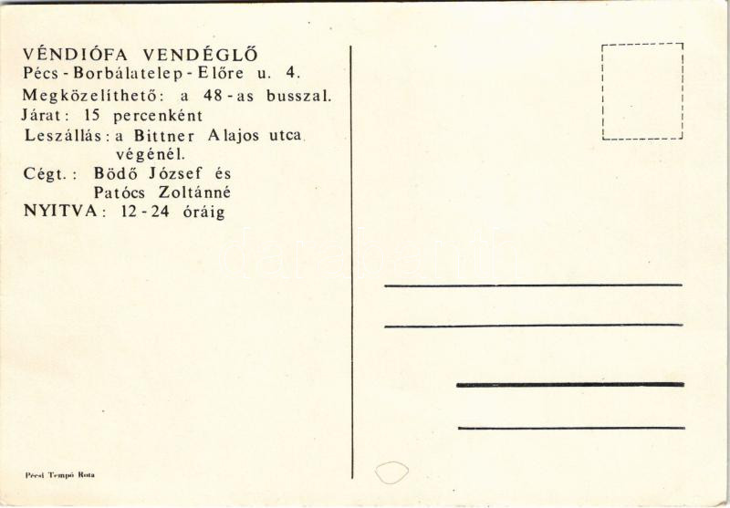 Leírás: Véndiófa vendéglő térképes reklám képeslap. Pécs-Borbálatelep, Előre u. 4. Cégt.: Bödő József és Patócs Zoltánné (EK)