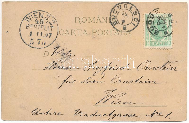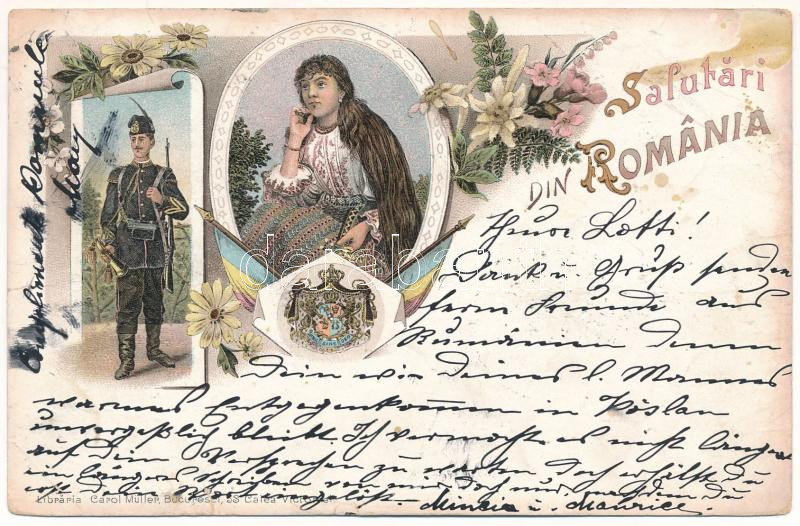 Leírás: 1897 (Vorläufer!) Salutari din Romania / Romanian folklore, coat of arms. Carol Müller Art Nouveau, floral, litho (tear)