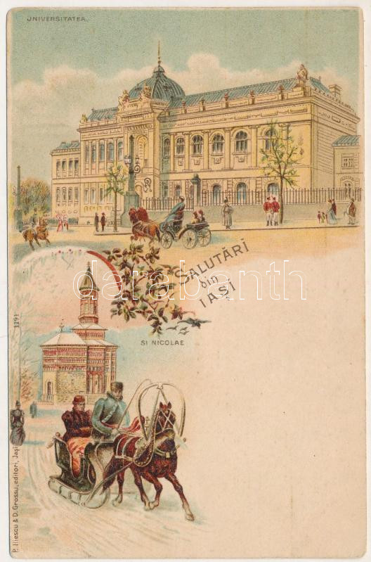 Iasi, Jasi, Jassy, Jászvásár; Universitatea, Biserica Sf. Nicolae / university, Orthodox church, sleigh, horse sled in winter. Art Nouveau, floral, litho (EK)