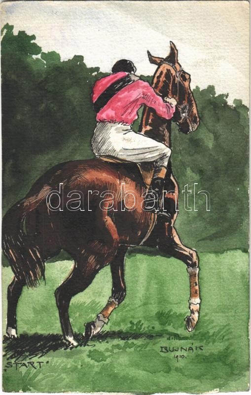 Leírás: 1910 Start / Lovassport. Kézzel rajzolt művészlap / Equestrian sport, horse racer. Hand-painted art postcard s: Bujnák (non PC) (EK)