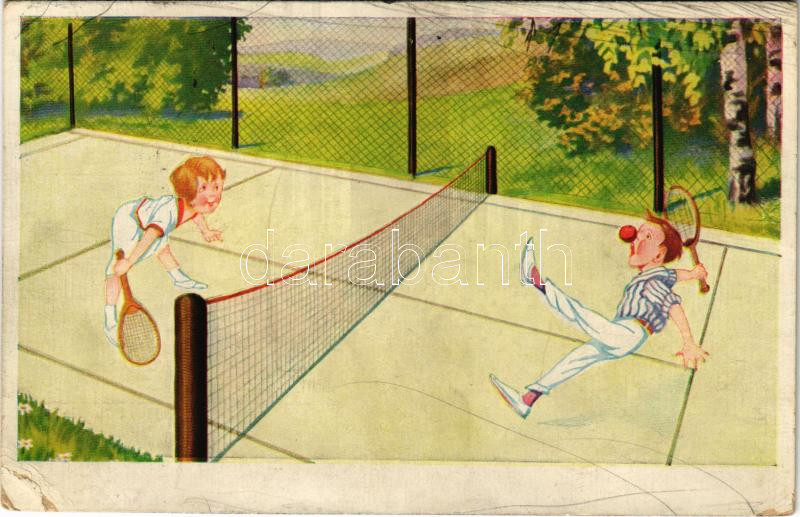 Tenisz meccs, humor / Tennis match, sport humour. WSSB 9592/3. (EK) https://www.darabanth.com/hu/472-Gyorsarveres/472.0/Kepeslapok/Sport~1500081/Tenisz-meccs-humor-Tennis-match-sport-humour-WSSB-95923-EK~II3199000