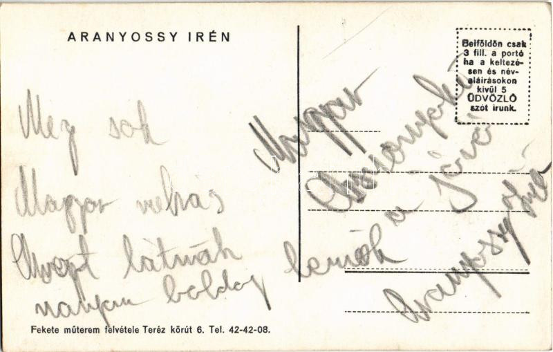 Aranyossy Irén. Fekete műterem felvétele, hátoldalon autográf aláírásá... https://www.darabanth.com/hu/472-Gyorsarveres/472.0/Kepeslapok/Szinesz~1500085/Aranyossy-Iren-Fekete-muterem-felvetele-hatoldalon-autograf-alairasaval-EK~II3195152