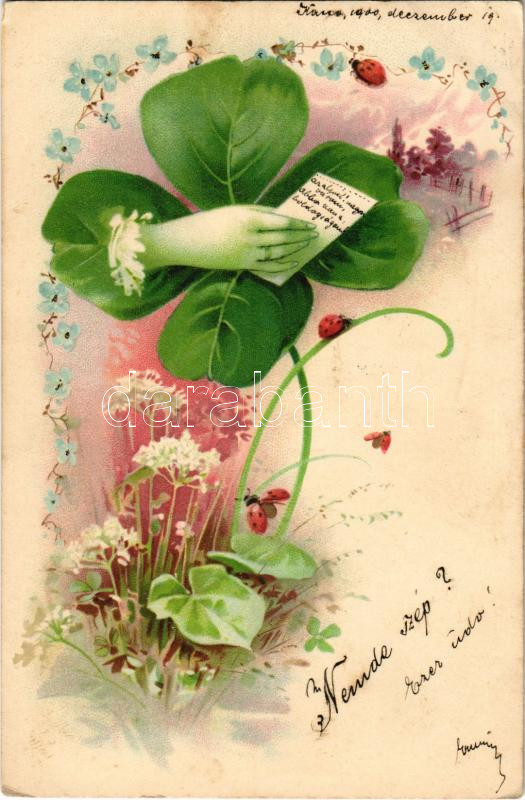 1900 Art Nouveau, floral, litho greeting card with clover (EK) https://www.darabanth.com/hu/472-Gyorsarveres/472.0/Kepeslapok/Udvozlolapok-Unnepek~1500092/1900-Art-Nouveau-floral-litho-greeting-card-with-clover-EK~II3199405
