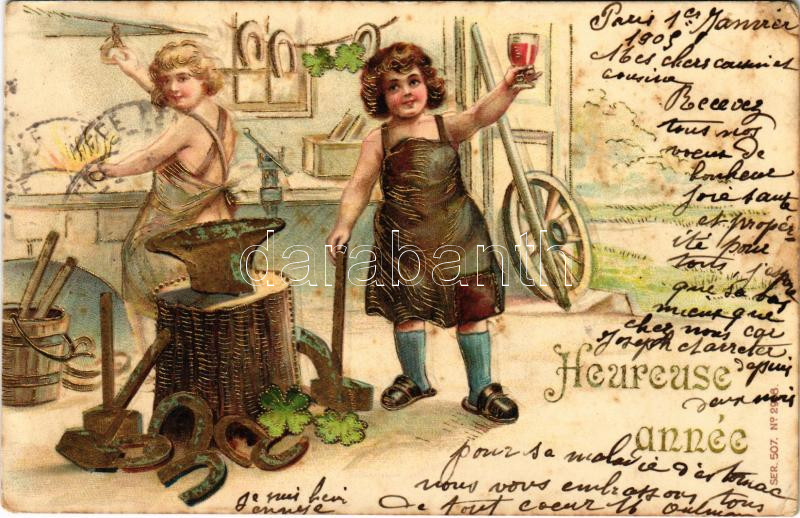 1905 Heureuse année / New Year greeting art postcard with blacksmiths,... https://www.darabanth.com/hu/472-Gyorsarveres/472.0/Kepeslapok/Udvozlolapok-Unnepek~1500092/1905-Heureuse-annee-New-Year-greeting-art-postcard-with-blacksmiths-horseshoes-and-clovers-Emb~II3199553
