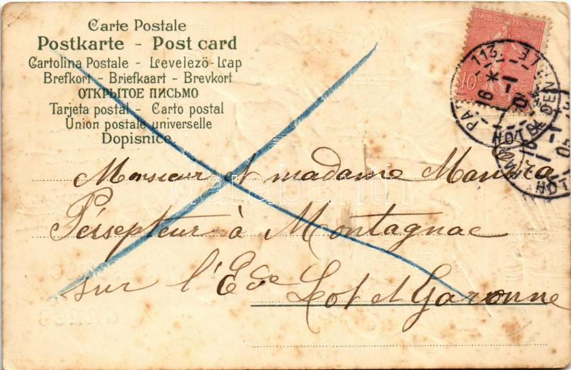 Leírás: 1905 Heureuse année / New Year greeting art postcard with blacksmiths, horseshoes and clovers. Emb. litho (EK)