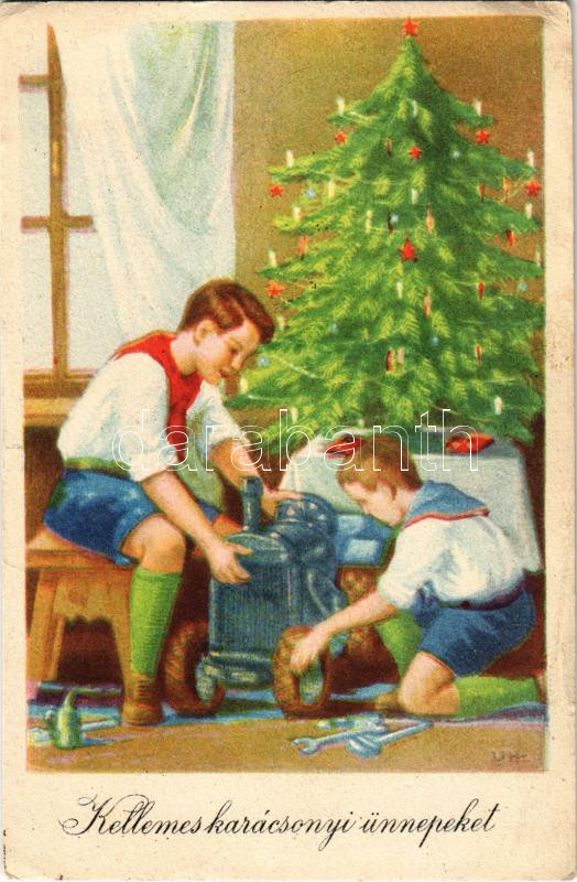 Leírás: 1950 Kellemes karácsonyi ünnepeket! Magyar szocialista úttörő karácsonyi üdvözlő propagandalap traktorral. Művészeti Alkotások / Hungarian socialist propaganda with Christmas greetings, pioneer movement, tractor (EB)
