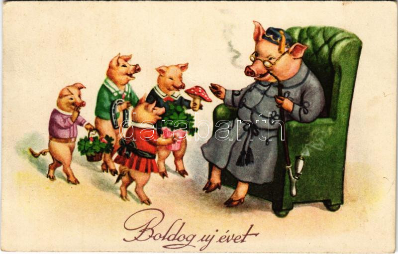 Boldog újévet! malac család / New Year greeting, pig family. WSSB 8909... https://www.darabanth.com/hu/472-Gyorsarveres/472.0/Kepeslapok/Udvozlolapok-Unnepek~1500092/Boldog-ujevet-malac-csalad-New-Year-greeting-pig-family-WSSB-8909-Rb~II3180352