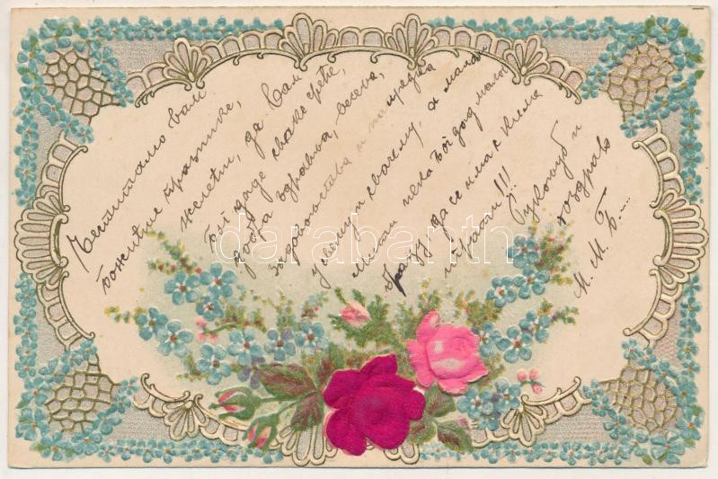 Leírás: Dombornyomott virágos selyem üdvözlőlap / Art Nouveau embossed litho greeting silk card. A. Schwidernoch