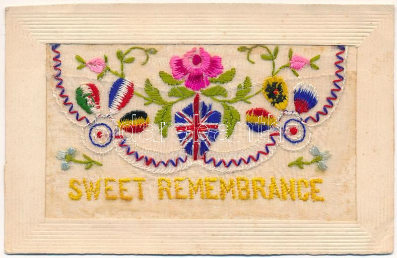 Leírás: Sweet Remembrance / embroidered silk greeting card with flowers and flags (vágott / cut)