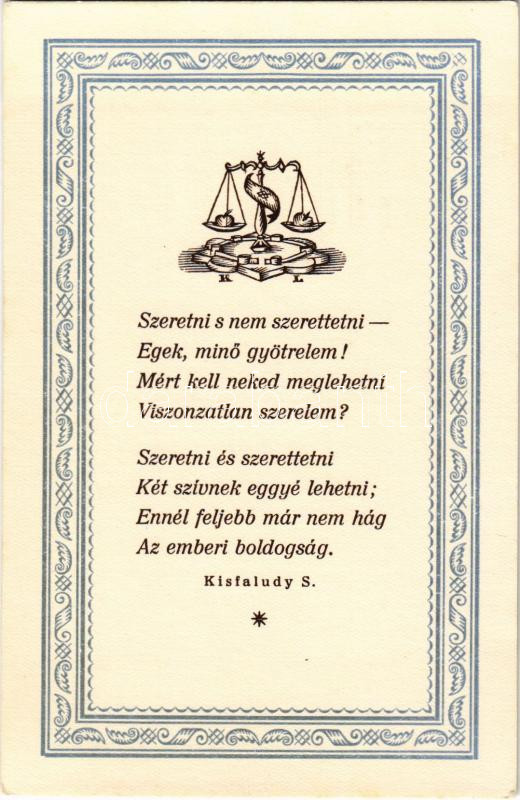 Szeretni s nem szerettetni - egek minő gyötrelem! Miért kell neked meglehetni viszonzatlan szerelem? Romantikus levelezőlap Kisfaludy Sándor versével. Kner Izidor kiadása