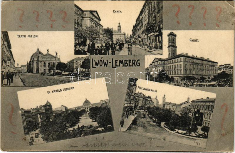 1908 Lviv, Lwów, Lemberg; Rynek, Teatr Mieski, Ratusz, Ul. Karola Ludwika, Plac Akademicki / market square, town hall, theatre, street, Academy Square (EK)