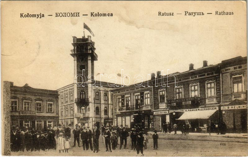 Leírás: 1916 Kolomyia, Kolomyja, Kolomyya, Kolomea; Ratusz / Rathaus /street view, town hall, Grand Hotel Bahr, shops of K. Ramler, J. Nadler, B. Helwing (EK)