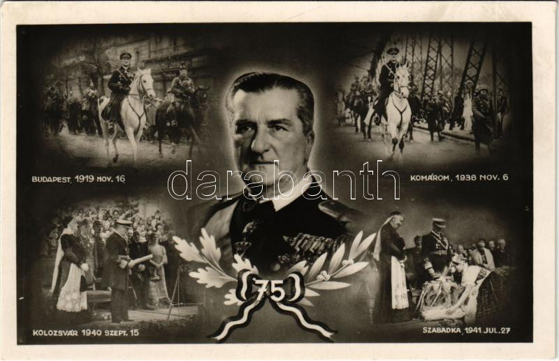 1868-1943 Horthy Miklós 75. születésnapja emléklap, Magyarország Országgyarapító Kormányzója; Budapest, Komárom, Kolozsvár, Szabadka, bevonulási képekkel / 75th birthday of Horthy, memorial postcard with pictures of the entry of the Hungarian troops in 1938-41 (EM)