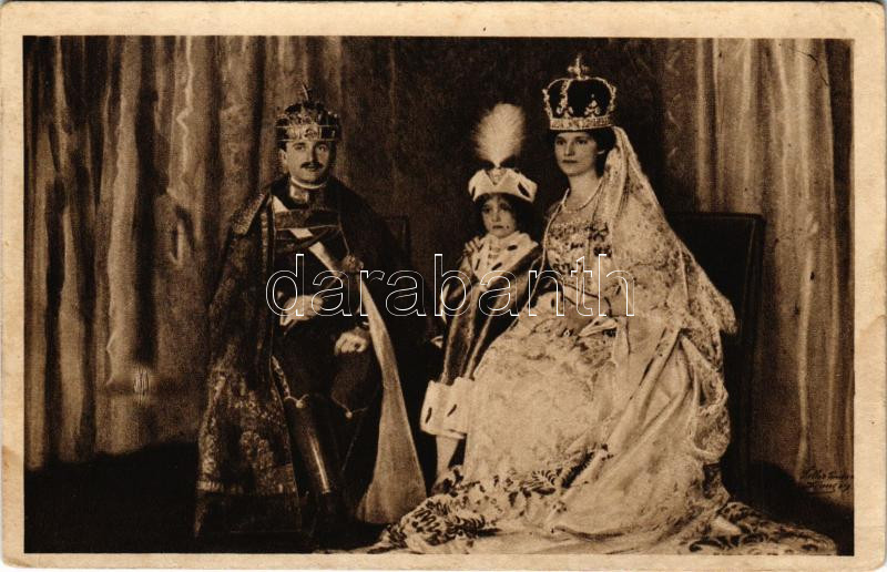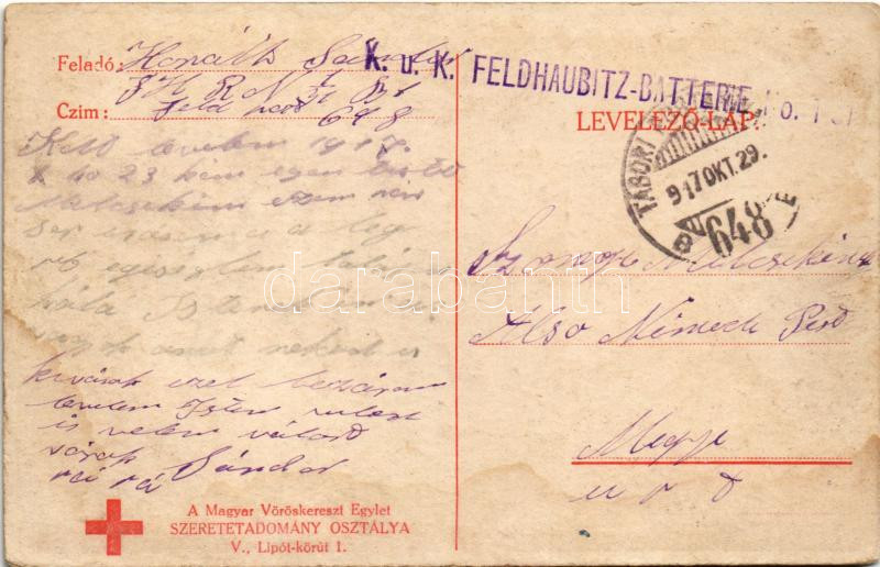 1917 IV. Károly és Zita királyné a kis Ferenc József Ottó trónörökössel. A Magyar Vöröskereszt Egylet Szeretetadomány Osztálya / Charles I of Austria, Queen Zita and Crown Prince Otto + "K.u.K. FELDHAUBITZ-BATTERIE Nr. ..." "Tábori Postahivatal 648" (ázott / wet damage)