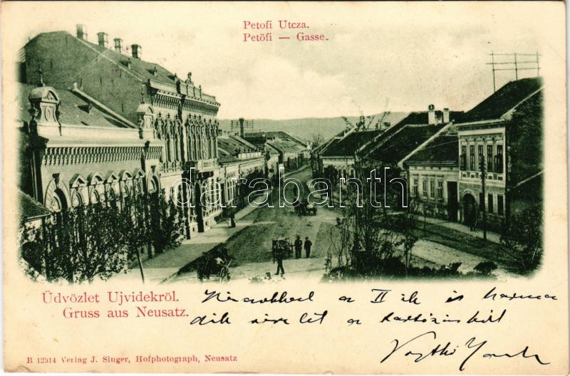 1901 Újvidék, Novi Sad; Petőfi utca. J. Singer kiadása / street view (... https://www.darabanth.com/hu/472-Gyorsarveres/472.0/Kepeslapok/Vajdasag~1500011/1901-Ujvidek-Novi-Sad-Petofi-utca-J-Singer-kiadasa-street-view-kis-szakadas-small-tear~II3165976