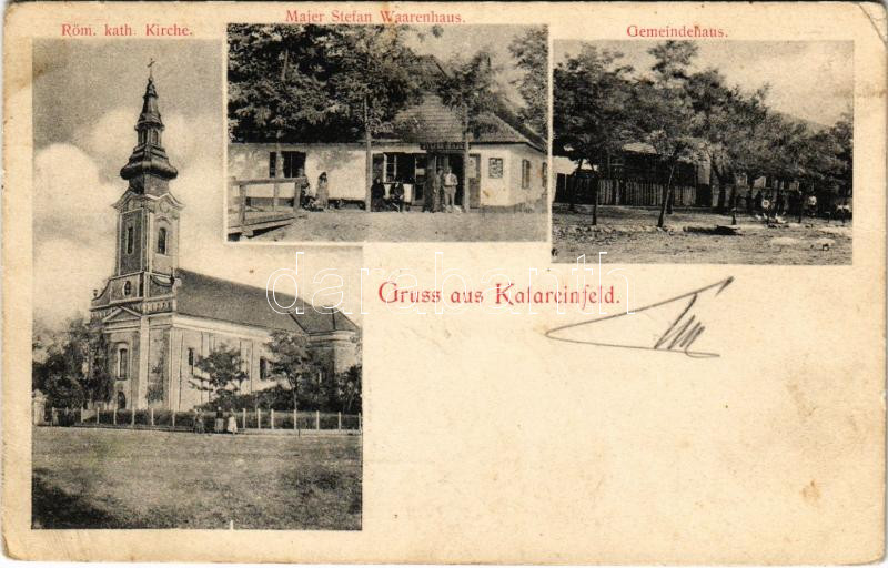 1906 Katalinfalva, Kathreinfeld, Katareinfeld, Ravni Topolovac; Röm. kath. Kirche, Gemeindehaus, Majer Stefan Warenhaus / Római katolikus templom, Községháza, Majer Stefan üzlete / Catholic church, town hall, shop (fl)