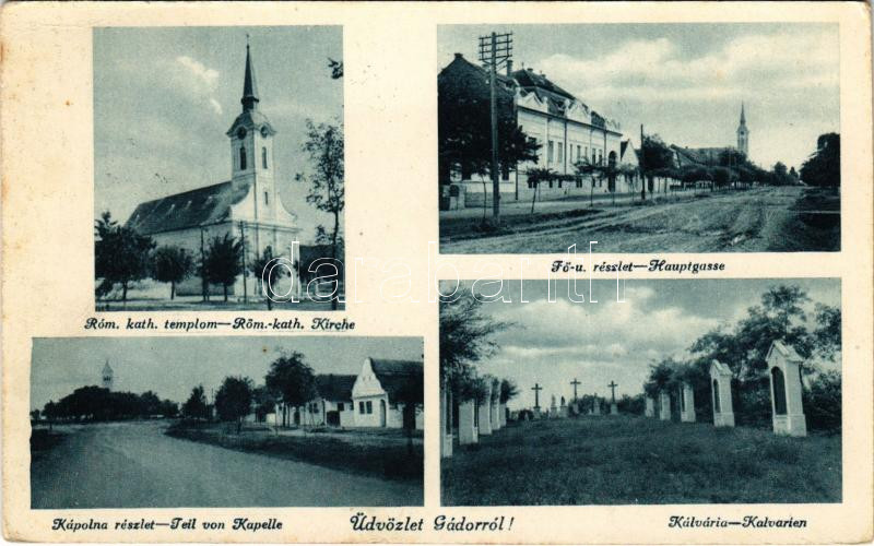 Leírás: 1944 Gádor, Gákova, Gakovo; Római katolikus templom, Fő utca, Kálvária, Kápolna (EK)