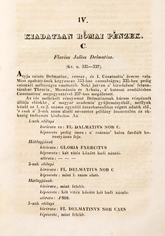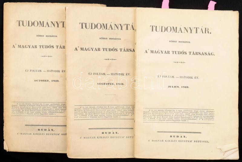 1842 Tudománytár. Új folyam. Hatodik év. 1842. julius. Értekezések. 12. kötet., 1842. augusztus, october. Szerk.: Luczenbacher János és Almási Balogh Pál. Közre' bocsátja a' Magyar Tudós Társaság. Buda, 1842, Magyar Királyi Egyetem' betűivel, 1-66,241-280 p.+1 t.; 67-130,281-320 p.;195-258,361-400 p. Benne numizmatikai témájú írással is: [Érdy János] Luczenbacher János: Kiadatlan római pénzek. Hozzá tartozó rézmetszetű képtáblával. Kiadói papírkötés, szakadt borítókkal, az október kötetének a gerince hiányos, a füzet teste nagyrészt szétvált.