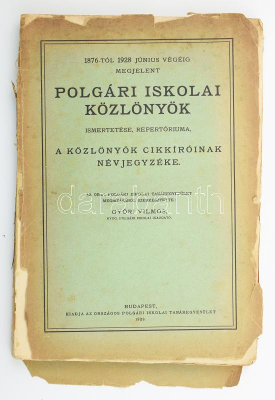 1876-tól 1928 június végéig megjelent polgári iskolai közlönyök ismertetése, repertóriuma, a közlönyök cikkíróinak névjegyzéke. Szerk.: Győri Vilmos. Bp., 1929, Országos Polgári Iskolai Tanáregyesület, (Kir. M. Egyetemi Nyomda), 218 p. Kiadói papírkötés, leszakadt borítóval, sérült, hiányos gerinccel, sérült kötéssel.