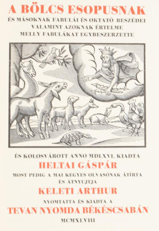 A Bölcs Esopusnak és másoknak fabulái és oktató beszédei, valamint azoknak értelme melly fabulákat egybeszerzette és Kolosvárott anno MDLXVI. kiadta Heltai Gáspár, most pedig a mai kegyes olvasónak átírta és átnyujtja Keleti Arthur. Békéscsaba, 1948, Tevan-ny., 147+5 p. 2. kiadás. Kiadói félvászon-kötés, kissé kopott borítóval.