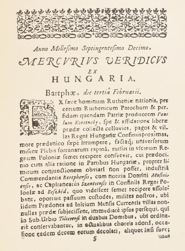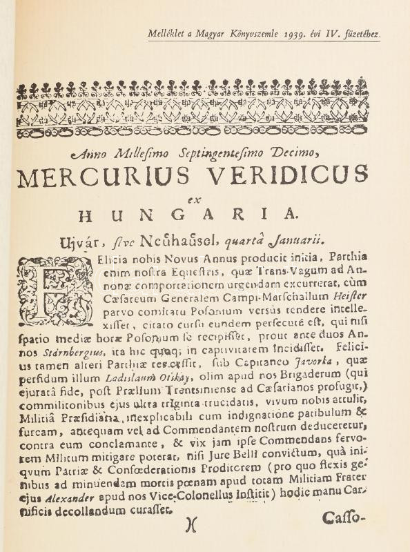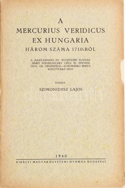 A Mercurius Veridicus ex Hungaria három száma 1710-ből. A Magyarhoni Ev. Egyetemes Egyház "Báró Podmaniczky Géza és hitvese, szül. Gr. Dégenfeld-Schomberg Berta Könyvtárában." Bp., 1940, Kir. M. Egyetemi Nyomda, 12 sztl. lev. Különlenyomat. Kiadói papírkötés, szakadt borítóval.