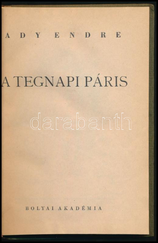 Ady Endre: A tegnapi Páris. Összegyűjtötte és sajtó alá rendezte: Kovách Aladár. Bolyai Könyvek 25. köt. (Bp., 1942), Bolyai Akadémia, 128 p. Első kiadás. Kiadói félvászon-kötés.