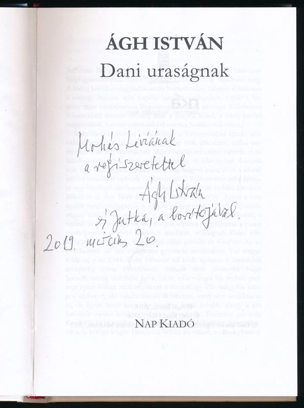 Ágh István: Dani uraságnak. A szerző, Ágh István (1938-) Kossuth- és József Attila-díjas költő, író, műfordító valamint Széles Judit (1939-2021) textilművész, Ágh István felesége, a borító illusztrátora által Mohás Lívia (1928-2024) pszichológus, József Attila-díjas írónak DEDIKÁLT példány. Magyar Esszék. Bp., 2018, Nap. Kiadói kartonált papírkötés.