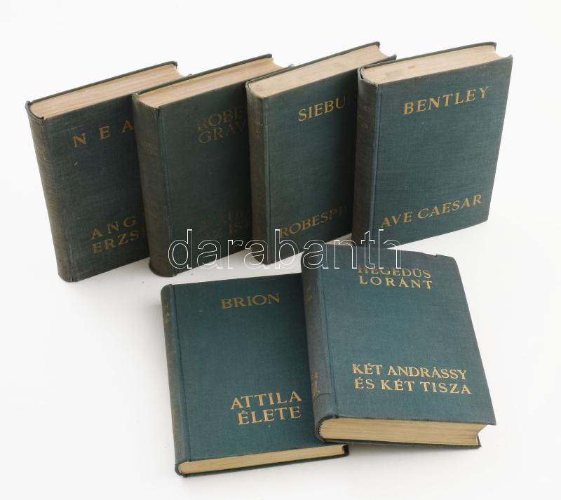 Athenaeum könyvsorozatának 6 kötete: Hegedűs Loránt: Két Andrássy és két Tisza.; Marcell Brion: Attila élete. Ford: Salgó Ernő., Friedrich Sieburg: Robespierre. Ford.: Lányi Viktor, Phyllis Bentley: Ave Caesar! Ford.: Sátori Béla., J. E. Neale: Angliali Erzsébet. Ford.: Salgó Ernő.; Robert Graves: Claudius, az isten és felesége Messalina. Ford.: Pálóczi Horváth György. Bp.,én,Athenaeum. Kiadói aranyozott zöld egészvászon-kötés, változó állapotban, kopott borítókkal, egy kötet laza fűzéssel, két kijáró lappal. 1 kötetben: Kardos János ügyvéd névbélyegzéseivel és aláírásával. Valamint 3 kötetben: Dinnyés Lajos (1901-1961) kisgazda politikus, országgyűlési képviselő, miniszterelnök névbejegyzésével és névbélyegzésével. Kardos János (1894-1959) ügyvéd. A második világháború után - amíg tehette - több kiemelt koncepciós perben is közreműködött védőként. (Szomathelyi Ferenc, Dálnoki Veress Lajos, András Sándor, Esterházy Pál herceg, Ordass Lajos, Rácz Sándor, Tóth Ilona ..stb.)