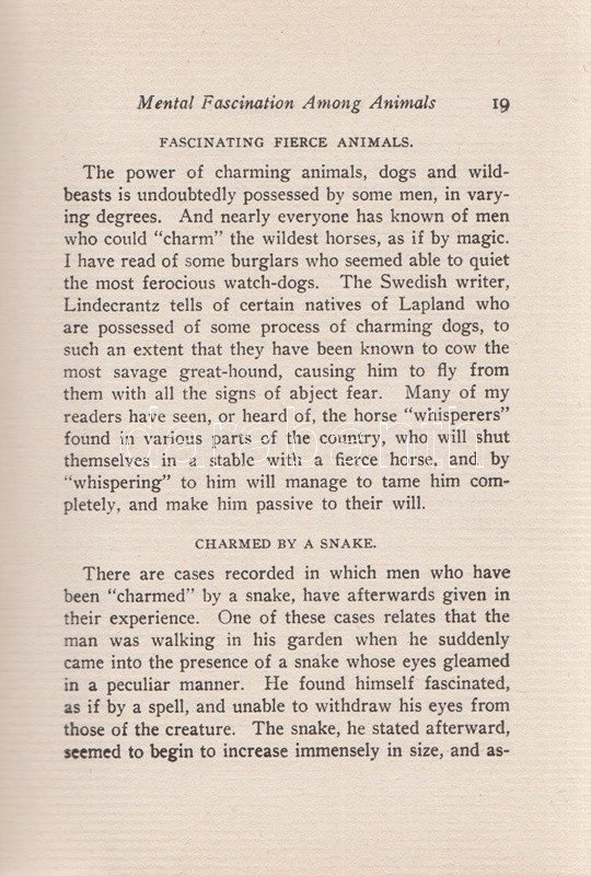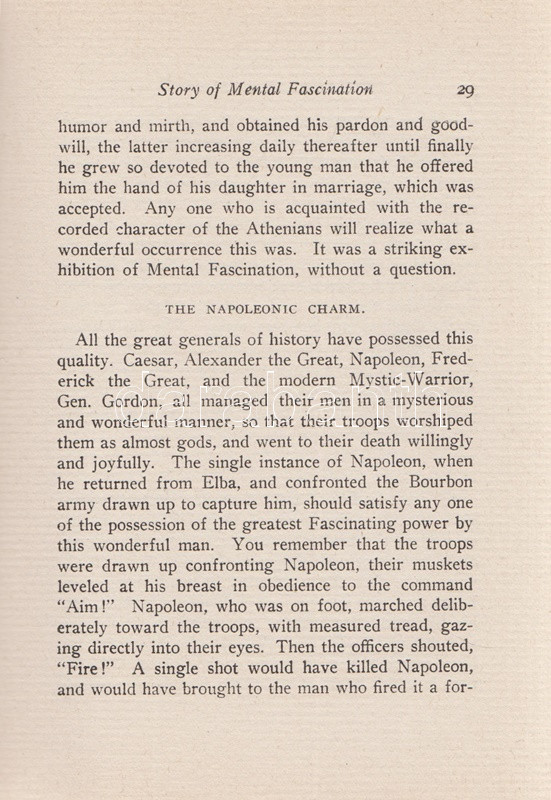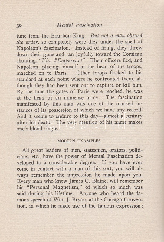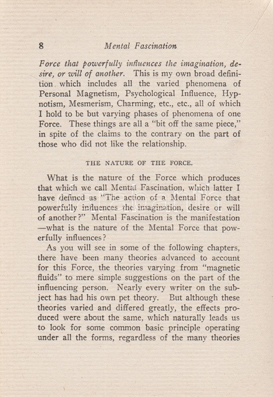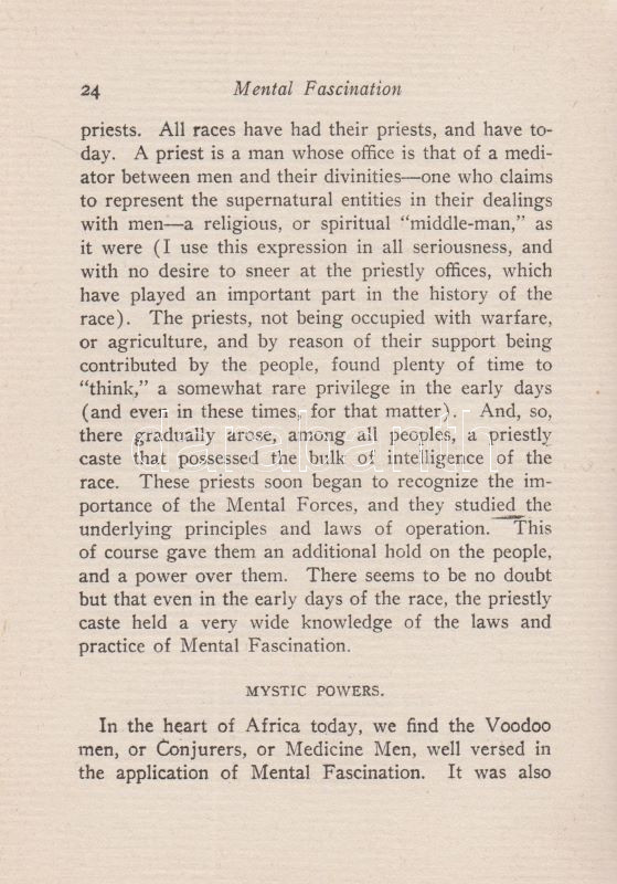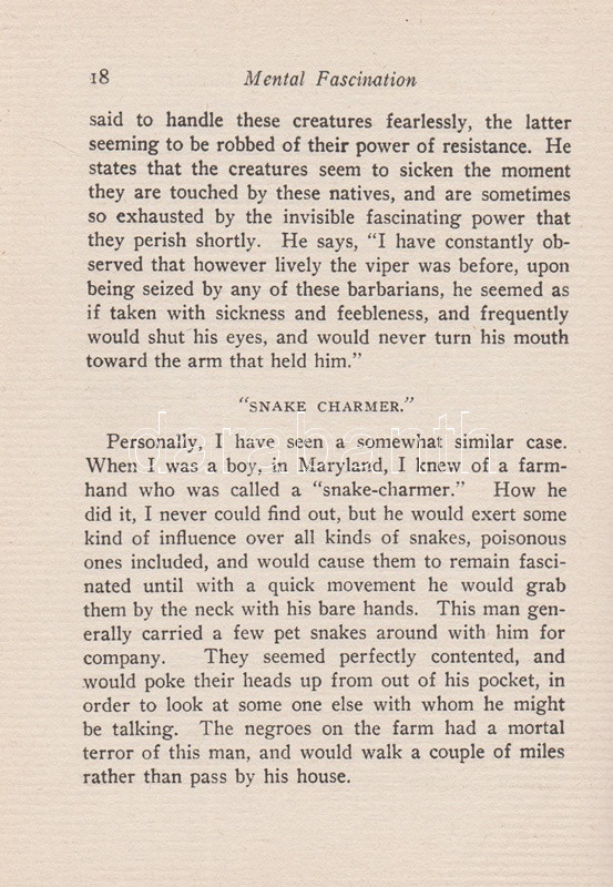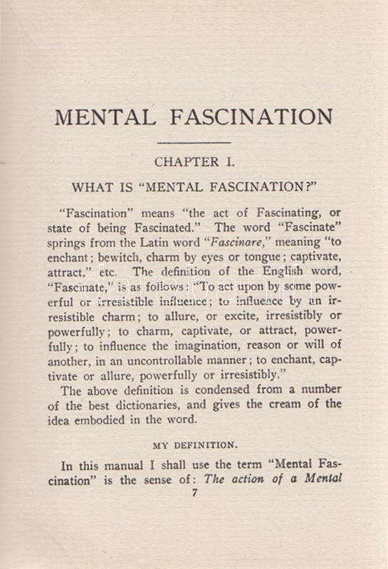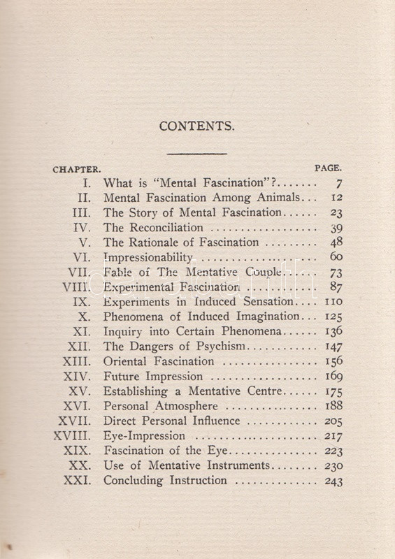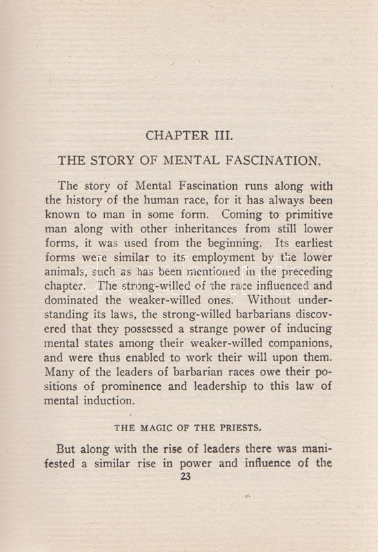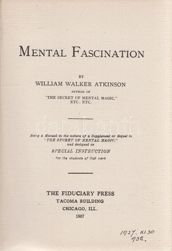 Atkinson, William Walker: Mental Fascination. Being a Manual in the nature of a Supplement or Sequel to ,,The Secret of Mental Magic" and designed as Special Instruction for the students of that work. Chicago, 1907. The Fiduciary Press. 253 + [3] p. Első kiadás. William Walker Atkinson (1862-1932) amerikai üzletember, jogász, okkultista. A kereskedelmi és jogi világban sikeres baltimore-i ügyvéd idegösszeroppanása után, az 1890-es években csatlakozott a keleti parton népszerű ezoterikus mozgalomhoz, és annak termékeny írója és népszerűsítője lett. Angol nyelvű kötete a hipnózis, az üzleti életben is kamatoztatható személyes vonzerő felkeltésének okkult praktikáit ismerteti, némi kultúrtörténeti bevezetővel. Az első előzéken régi tulajdonosi bélyegzés, a címoldalon tulajdonosi jegyzet. Poss.: Gyöngyöshalászy Takách Zoltán [Gyöngyöshalászy Takách Zoltán magyar származású zongoraművész, zongoratanár és zeneszerző. A budapesti Zeneakadémián tanult művész az 1900-as évek első évtizedében magas rangú magyar diplomaták ajánlásával került az amerikai komolyzenei élet sodrába - az amerikai keleti part nagyvárosaiban, New Yorkban, Philadelphiában és az amerikai elit üdülőhelyein lépett fel, egyúttal magán zeneiskolát is fenntartott Amerikában.] Kiadói egészvászon kötésben. Jó példány.