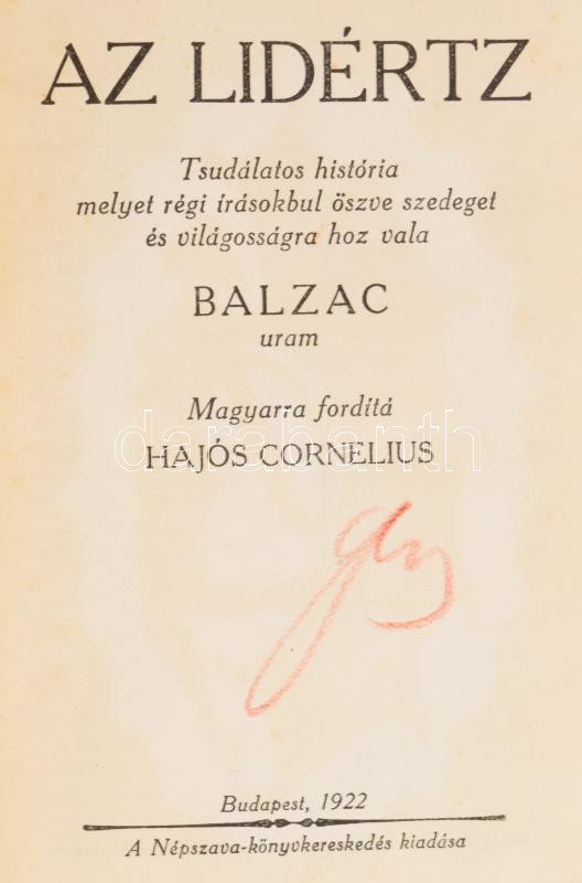 Leírás: Balzac, [Honoré de]: Az lidértz. Tsudálatos história, melyet régi írásokbul öszve szedeget és világosságra hoz vala - - uram. Magyarra fordítás Hajós [Kornél] Cornelius. Bp., 1922, Népszava, 95+(1) p. Révész Kornél illusztrációival. Kiadói kartonált papírkötés, minimálisan sérült borítóval.