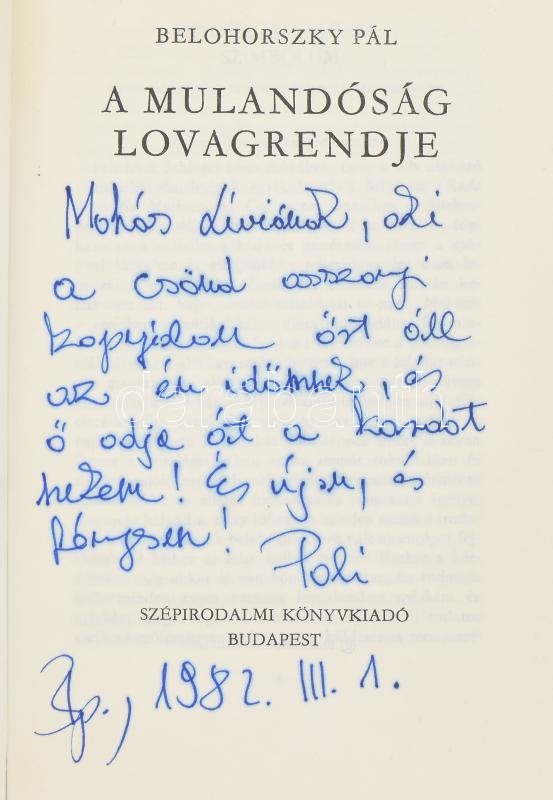 Belohorszky Pál: A mulandóság lovagrendje. A szerző, Belohorszky Pál (1948-1988) irodalomtörténész, esszéíró, kritikus által Mohás Lívia (1928-2024) pszichológus, József Attila-díjas író részére DEDIKÁLT példány. Bp.,1982., Szépirodalmi. Kiadói egészvászon-kötés, kiadói papír védőborítóban.