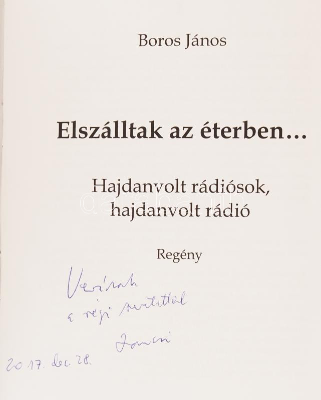 Leírás: Boros János: Elszálltak az éterben... Hajdanvolt rádiósok, hajdanvolt rádió. DEDIKÁLT! Regény. hn.,én., Szerzői. Kiadói kartonált papírkötés, címlaphiánnyal.