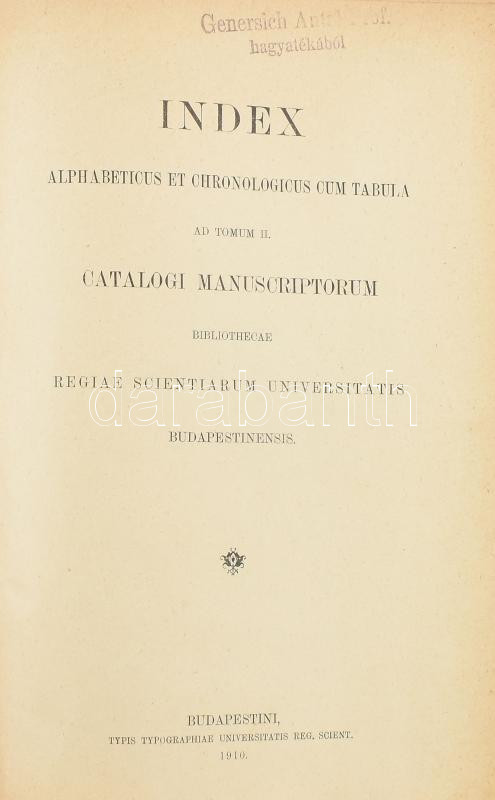 Catalogus Manuscriptorum Bibliothecae Reg. Scient. Universitatis Budapestinensis. Tomus II. Pars IV. Index Alphabeticus Et Chronologicus Cum Tabula. Index Alphabeticus Et Chronologicus Cum Tabula Ad Tomum II. Catalogi Manuscriptorum Bibliothecae Regiae Scientiarum Universitatis Budapestinensis. Bp., 1910, Typis Typographiae Universitatis Reg. Scient. Latin nyelven. 280 p. Későbbi félvászon kötésben, az eredeti papírborítót a borítóra ragasztották (helytelenül a a hátoldalára), előzéklapon és címlapon Genersich Antal Prof. hagyatékából bélyegzővel, néhány lapon tollas jelöléssel.