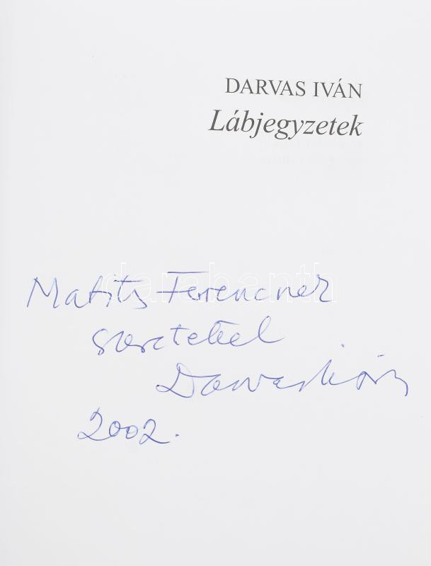 Leírás: Darvas Iván: Lábjegyzetek. A szerző, Darvas Iván (1925-2007) a Nemzet Színésze címmel kitüntetett, kétszeres Kossuth-díjas színművész által DEDIKÁLT! Bp., 2001, Európa. Kiadói kartonált papírkötés, kiadói papír védőborítóval.