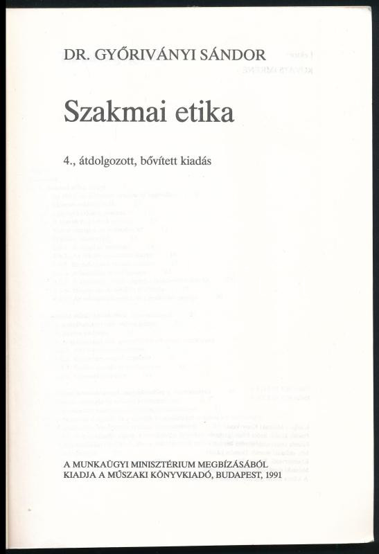 Dr. Győriványi Sándor: Szakmai etika. Bp., 1991, Műszaki Könyvkiadó. Negyedik, átdolgozott, bővített kiadás. Kiadói papírkötés, kissé kopott borítóval. Megjelent 2560 példányban.