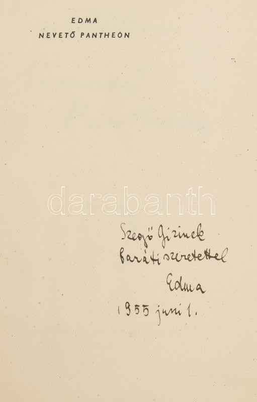 Leírás: Edma: Nevető Pantheon. Bp., 1955, Pantheon. A szerző karikatúráival. Kiadói félvászon-kötés. Szegő Gizi (1902-1985) grafikusnak DEDIKÁLT példány.