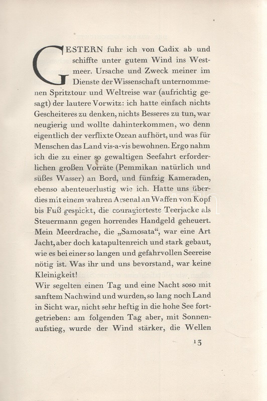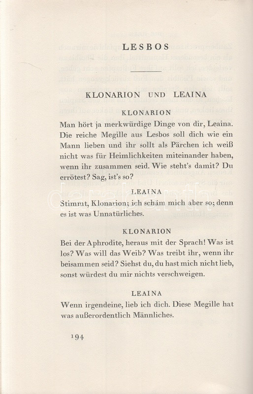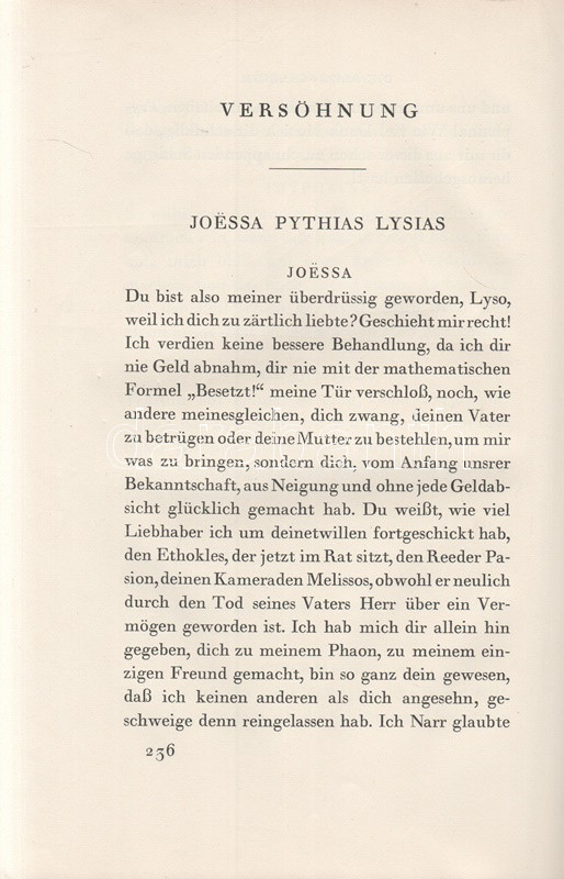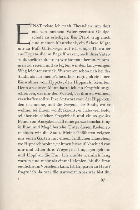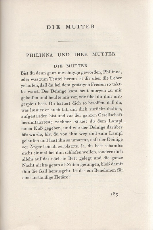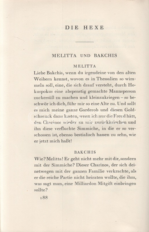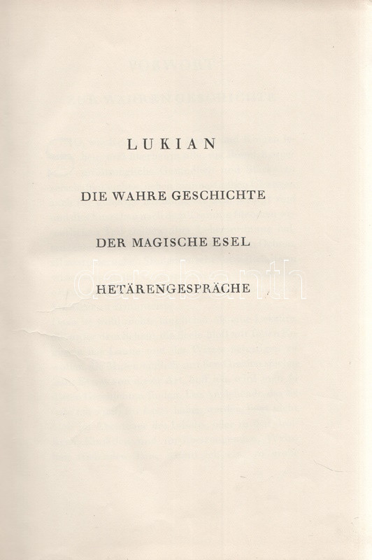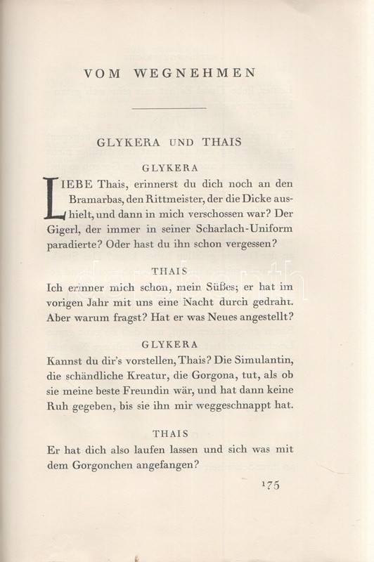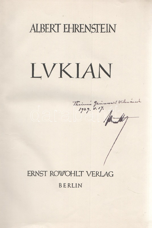 Ehrenstein, Albert: Lukian. [Lukiánosz-fordítások.] (Dedikált.) (Die wahre Geschichte - Der magische Esel - Hetärengespräche). Berlin, [1925]. Ernst Rowohlt Verlag (Gedruckt bei Poeschel & Trepte in Leipzig). 268 + [4] p. Egyetlen kiadás. Albert Ehrenstein (1886-1950) bécsi születésű német expresszionista költő dedikált fordításkötete, amelyben Lukiánosz ókori szatíraíró néhány művét adja közre német fordításban. Korábbi, 1911-es verseskötetét Oskar Kokoschka illusztrálta, az első világháború idején hadi szolgálatra alkalmatlannak nyilvánítását követően aktivista körökben mozgott, és részese volt a bécsi dadaista közösségnek is. A magyar felmenőkkel bíró Albert Ehrenstein magyar nyelvű dedikációja: ,,Thaiszné [?] Grünwald Vilmának. 1929. V. 17. Albert". Raabe 62, 37. Rowohlt I, 621. Wilpert-G. 30. Lexikon deutsch-jüdischer Autoren VI, 121.9. Feliratozott kiadói félvászon kötésben, az első kötéstáblán apró kopásokkal. Jó példány.
