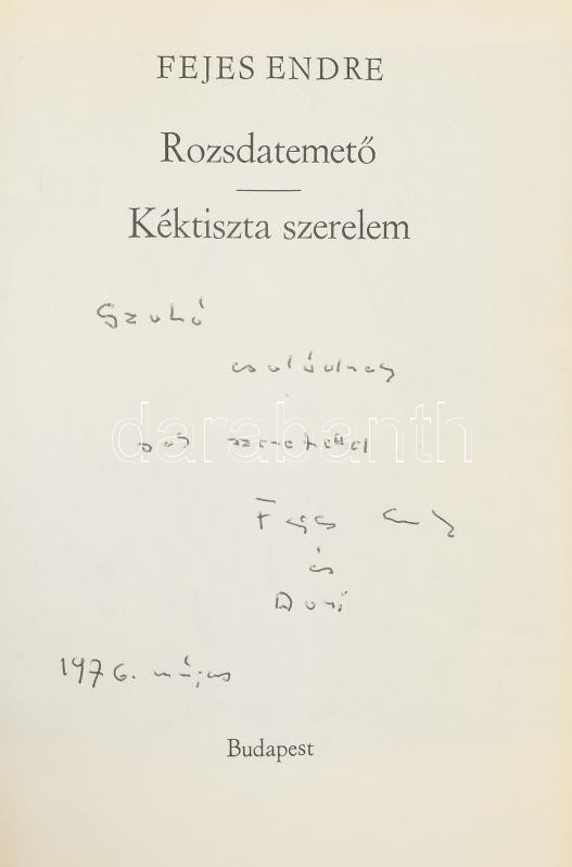 Fejes Endre: Rozsdatemető. Kéktiszta szerelem. DEDIKÁLT! 30 év. Bp., 1... https://www.darabanth.com/hu/472-Gyorsarveres/472.0/Konyvek/Konyvek-Egyeb-ritkasagok~500036/Fejes-Endre-Rozsdatemeto-Kektiszta-szerelem-DEDIKALT-30-ev-Bp-1976-Magveto-Kiadoi-eg~II3201274