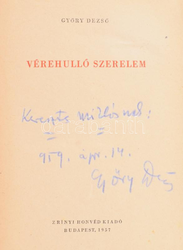 Győry Dezső: Vérehulló szerelem. DEDIKÁLT! Bp., 1957, Zrínyi. Kiadói f... https://www.darabanth.com/hu/472-Gyorsarveres/472.0/Konyvek/Konyvek-Egyeb-ritkasagok~500036/Gyory-Dezso-Verehullo-szerelem-DEDIKALT-Bp-1957-Zrinyi-Kiadoi-felvaszon-kotes-kop~II3174900