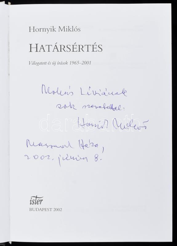 Hornyik Miklós: Határsértés. Válogatott és új írások 1965-2001. A szerző, Hornyik Miklós (1944 - 2012) író, újságíró, kritikus, szerkesztő által Mohás Lívia (1928-2024) pszichológus, József Attila-díjas írónak DEDIKÁLT példány. Bp., 2002, Ister. Kiadói papírkötés.