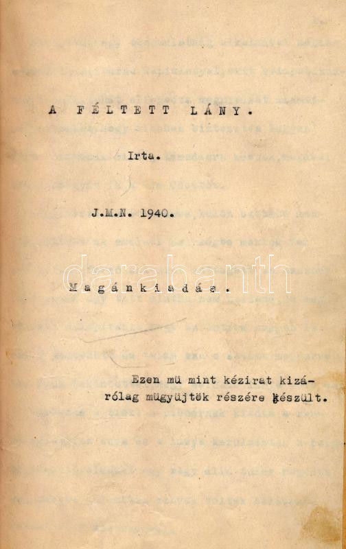 J. M. N.: A féltett lány. hn., 1940, Magánkiadás, 51 p. Gépirat. Papír... https://www.darabanth.com/hu/472-Gyorsarveres/472.0/Konyvek/Konyvek-Egyeb-ritkasagok~500036/J-M-N-A-feltett-lany-hn-1940-Magankiadas-51-p-Gepirat-Papirkotesben-Erotikus-po~II2988376