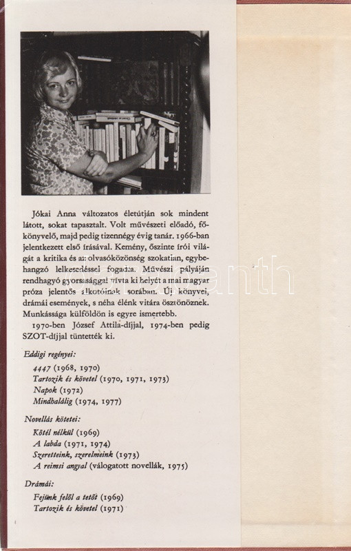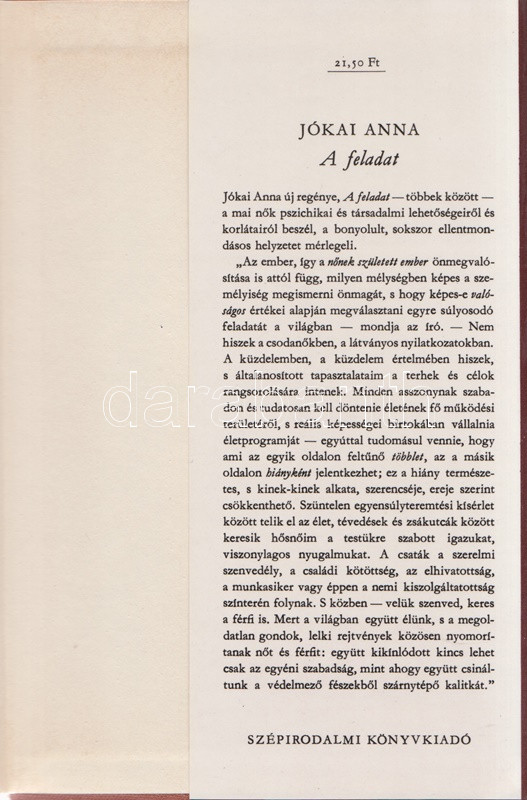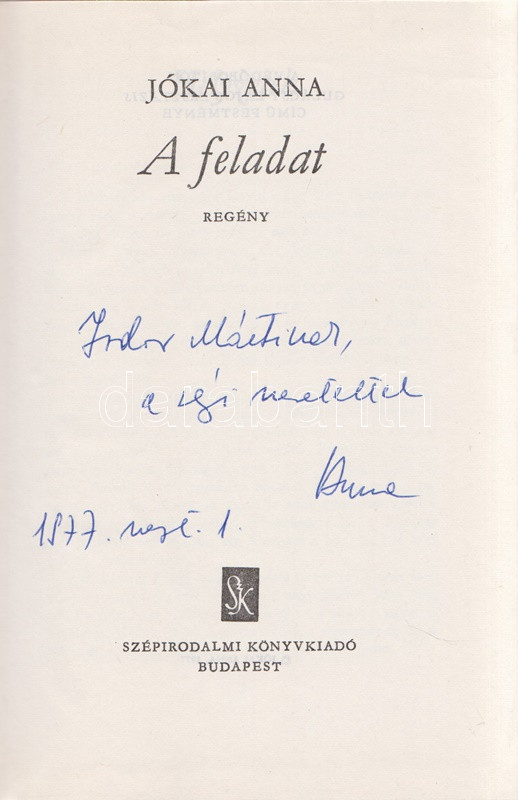 Budapest, (1977). Szépiro... https://www.darabanth.com/hu/472-Gyorsarveres/472.0/Konyvek/Konyvek-Egyeb-ritkasagok~500036/Jokai-Anna-A-feladat-Regeny-Dedikalt-Budapest-1977-Szepirodalmi-Konyvkiado-Kossut~II3122676
