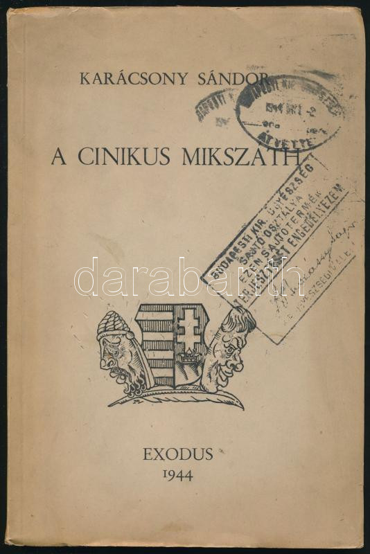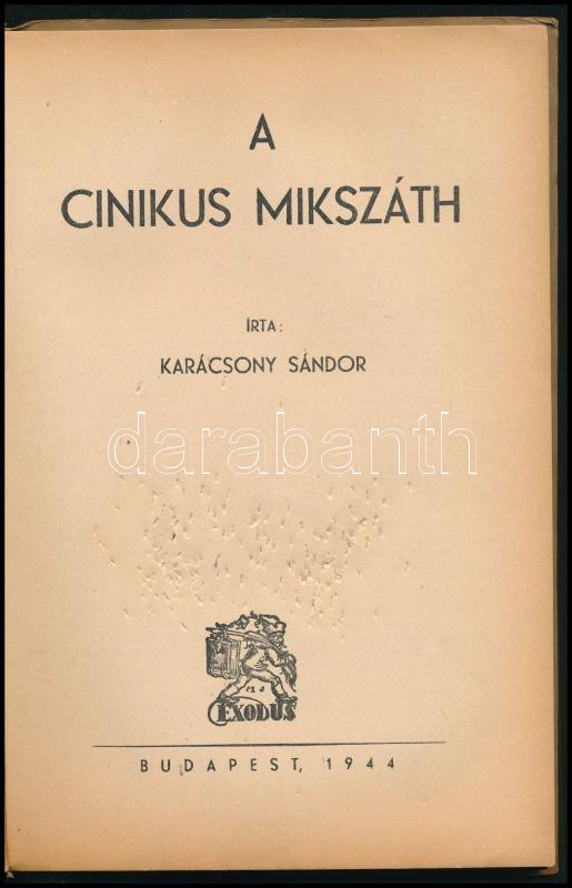 Karácsony Sándor: A cinikus Mikszáth. Bp., 1944, Exodus. Kiadói papírkötés, a borítón régi bélyegzésekkel, a könyv elején, (kb. 24 oldalig, rengeteg apró lyukkal és benyomódással.