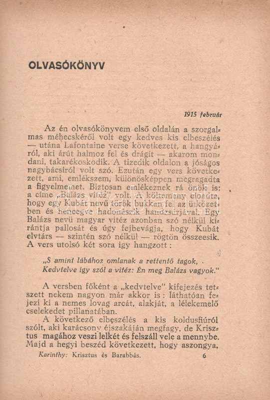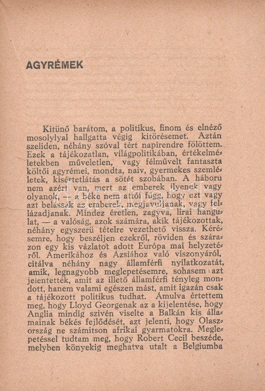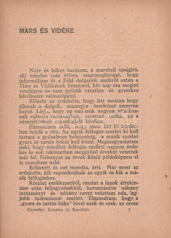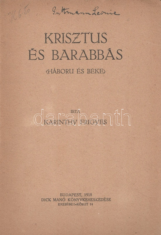 Karinthy Frigyes 1914-1918 között keletkezett hírlapi karcolataiból: tárcanovelláiból, közéleti, kulturális és politikai publicisztikáiból közölt válogatás. Példányunk fűzése laza, számos levél fűzése elengedett.