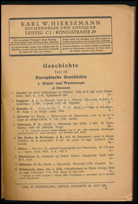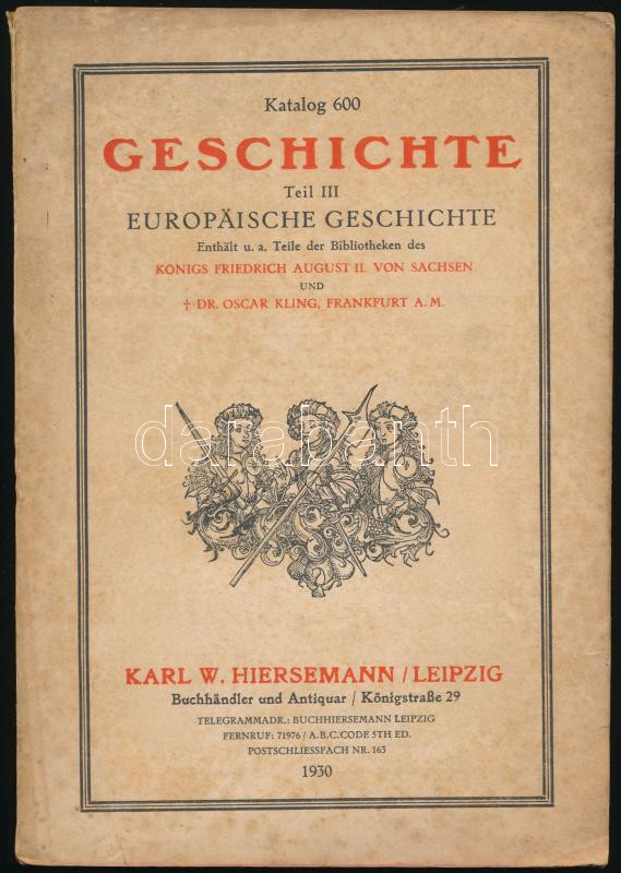 Karl W. Hiersemann Katalog 600. Geschichte Teil III: Europäische Geschichte. Enthält u. a. Teile der Bibliotheken des Königs Friedrich August II von Sachsen und Dr. Oscar Kling, Frankfurt A. M. Leipzig, 1930, Karl W. Hiersemann. Német nyelvű katalógus. Benne Magyarországra vonatkozó résszel (153-158 p.) Kiadói papírkötés, foltos borítóval.