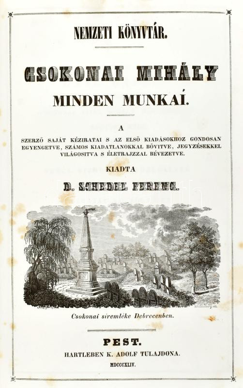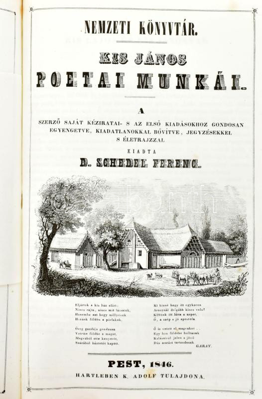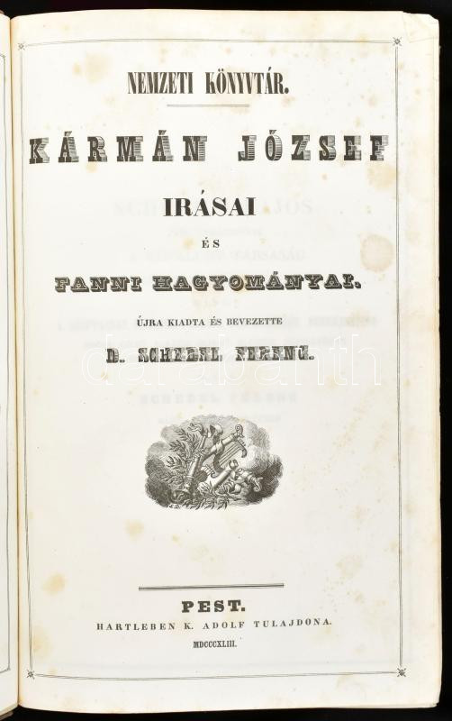 Kármán József irásai és Fanni hagyományai/Csokonai Mihály minden munkái/Kis János poetai munkái Pest, 1843-1846, Hartleben K. Adolf tulajdona, XVI h. + 148 h. + [1] t.: ill., 960 h. + [2] p. + C h. + [1] t.: ill., 462 h. + [1] p. + XLVI h. + [1] t.: ill. Három mű a Nemzeti Könyvtár sorozatból, egy kötetben . Kármán József irásai és Fanni hagyományai. Újra kiadta és bevezette: D. Schedel Ferenc [Toldy Ferenc]. Pest, 1843, Hartleben K. Adolf tulajdona, XVI h. + 148 h. + [1] t.: ill. Hártyapapírral védett címlapképen Fanni és Kármán portréját ábrázoló metszettel (Gedr. b. J. Rauh.) II. Csokonai Mihály minden munkái. A szerző saját kéziratai s az első kiadásokhoz gondosan egyengetve, számos kiadatlanokkal bővitve, jegyzésekkel világosítva s életrajzzal bévezetve. Kiadta: D. Schedel Ferenc [Toldy Ferenc]. Pest, 1844, Hartleben K. Adolf tulajdona, 960 h. + [2] p. + C h. + [1] t.: ill. Címlapképen Csokonai Vitéz Mihály portréját ábrázoló metszettel (Gedr. Bei J. Rauh.) III. Kis János poetai munkái. A szerző saját kéziratai- s az első kiadásokhoz gondosan egyengetve, kiadatlanokkal bővítve, jegyzésekkel s életrajzzal kiadta: D. Schedel Ferenc [Toldy Ferenc]. Pest, 1846, Hartleben K. Adolf tulajdona, 462 h. + [1] p. + XLVI h. + [1] t.: ill.+ Korabeli, aranyozott gerincű (minimálisan sérült) egészvászonkötésben A Nemzeti Könyvtár az irodalompártoló Kisfaludy Társaság által 1843 és 1853 között megjelentett könyvsorozat volt, amelyben összesen hat kötet jelent meg. Jelen tétel a sorozat első (Kármán József irásai és Fanni hagyományai), harmadik (Csokonai Mihály minden munkái) és negyedik (Kis János poetai munkái) kötetét tartalmazza. A könyvsorozatot Toldy Ferenc [1847-ig Schedel Ferenc] (1805-1875) irodalomtörténész, akadémikus, a tudományos igényű hazai irodalomtörténet-írás egyik úttörője adta ki